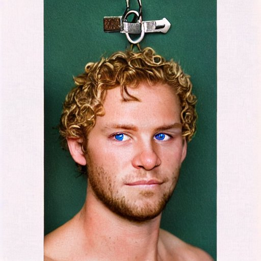 picture of man with curly blonde hair over one eye, green eyes, with a silver chain, with ceiling and closet in background